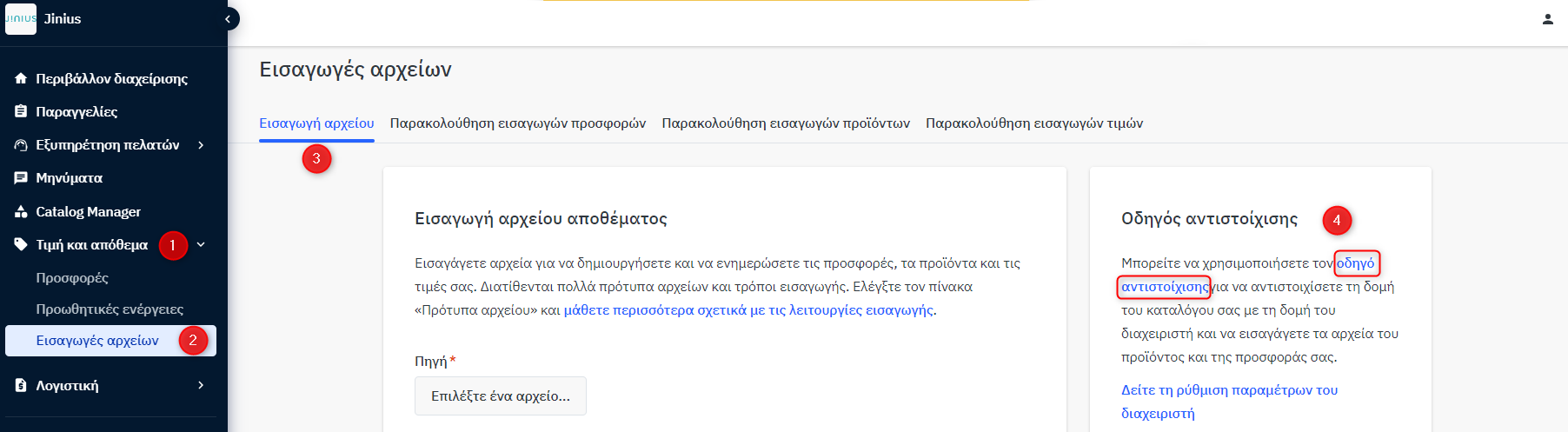 Εισαγωγή του αρχείου καταλόγου χρησιμοποιώντας τον Οδηγό ρύθμισης παραμέτρων Mirakl