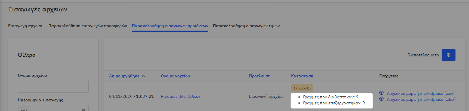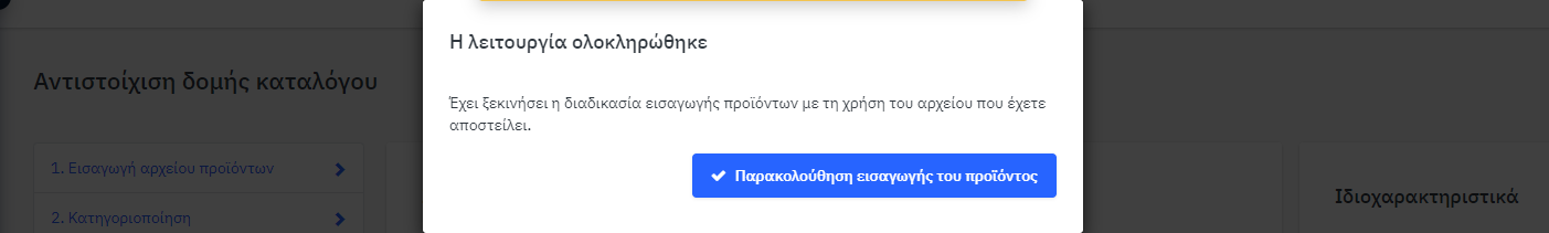 Η Mirakl θα επιχειρήσει τώρα να εισαγάγει τα προϊόντα από τον Κατάλογό σας με βάση τη διαμόρφωσή σας. Πατήστε το κουμπί «Παρακολούθηση εισαγωγής προϊόντος» που εμφανίζεται στην αναδυόμενη οθόνη για να ελέγξετε εάν η εισαγωγή έγινε με επιτυχία ή αν υπήρχαν σφάλματα.