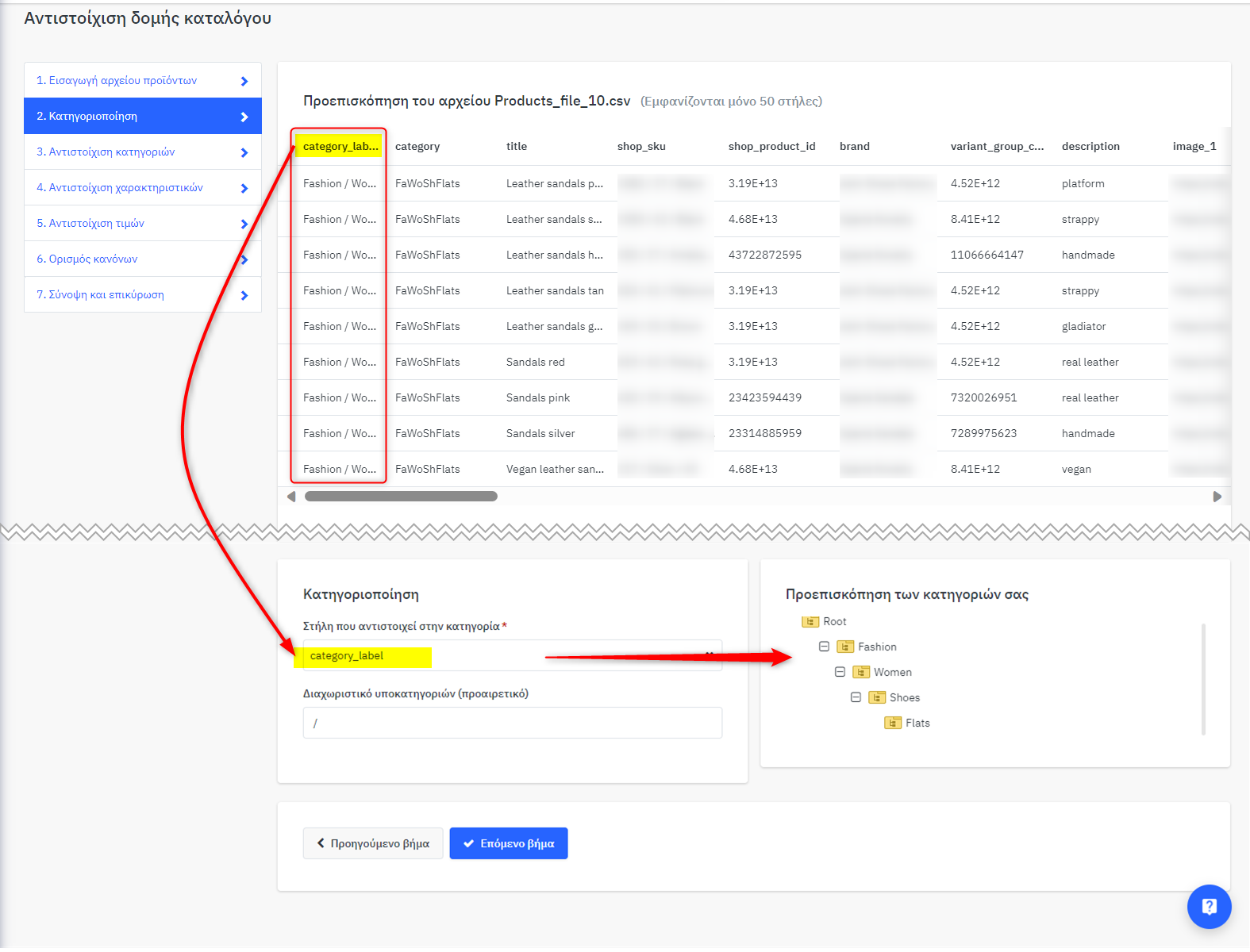 Στο παρακάτω παράδειγμα, η στήλη "category_label" είναι αυτή που προσδιορίζει κάθε Κατηγορία και αφού την επιλέξετε, στην Προεπισκόπηση εμφανίζονται όλες οι κατηγορίες των Προϊόντων που έχουμε ανεβάσει.