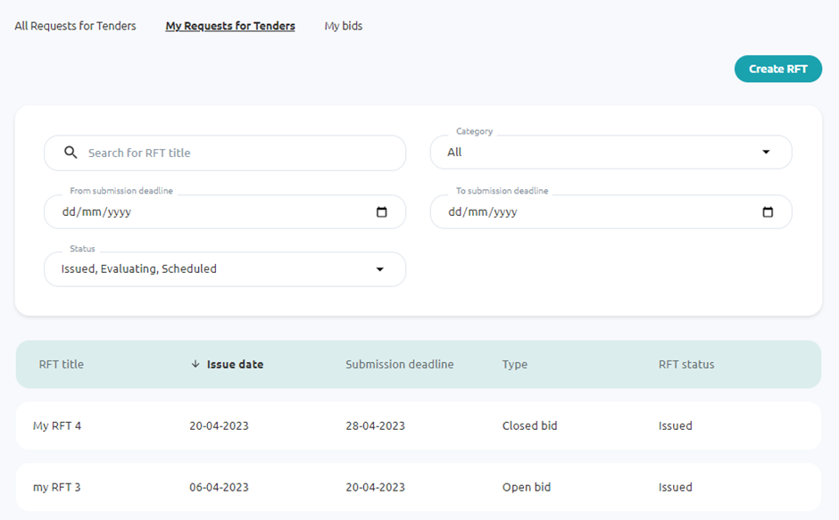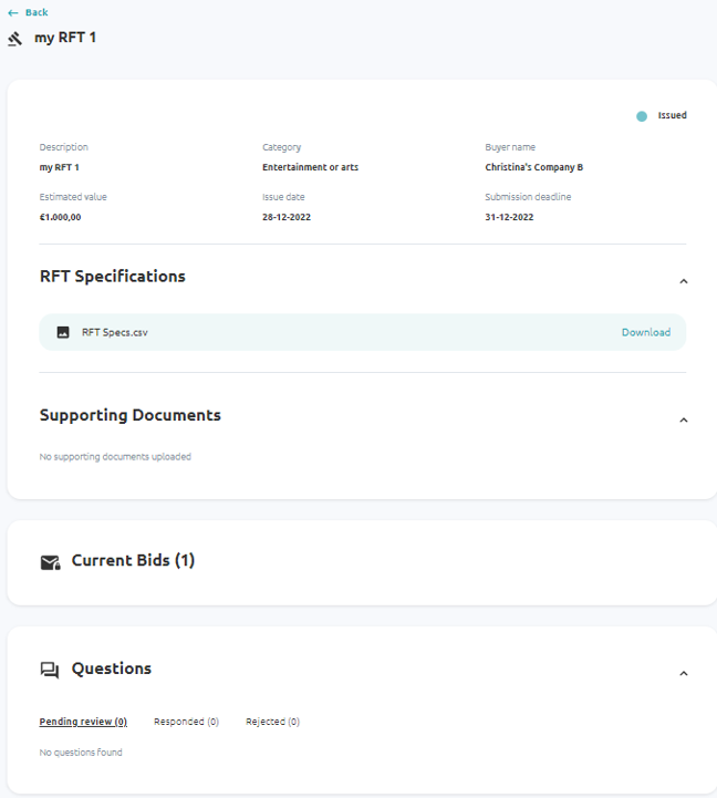 In the main menu, you select Tendering Management and from the tab ‘My RFTs’, you can click on an RFT to view the page with all RFT documentation and details, as submitted by yourself when creating the RFT. This page will be referred from now on as ‘RFT Page’.