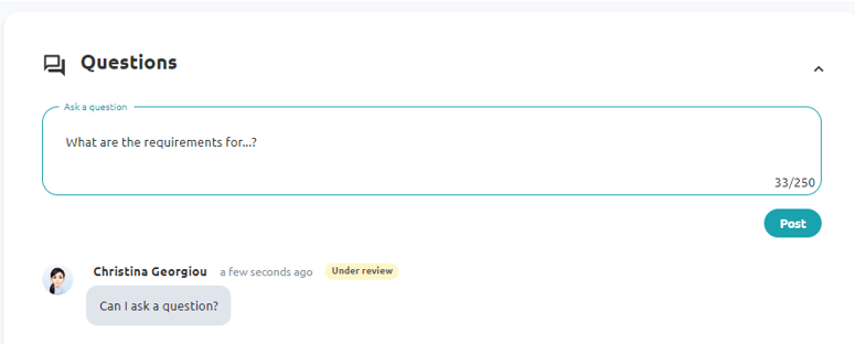 When you view an RFT page, there is a section named ‘Questions’. In that section type your question and click ‘Post’. Once you press ‘Post’, the question gets the status ‘Under review’ until the issuer of the RFT, the Buyer, replies to you or rejects the question. If the issuer replies to you, the question will be publicly available to everyone having access on the RFT, but your name will be hidden from other potential suppliers.