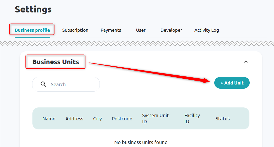 - Here, go to the Business profile tab and scroll down to the Business Units section. Here press + Add Unit to add a new Business Unit.