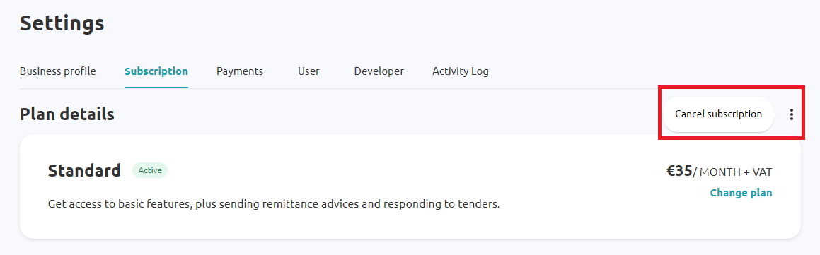 Navigate to the Subscription tab, where you can see your current plan details, hover over the 3 dots on the right and click Cancel subscription.