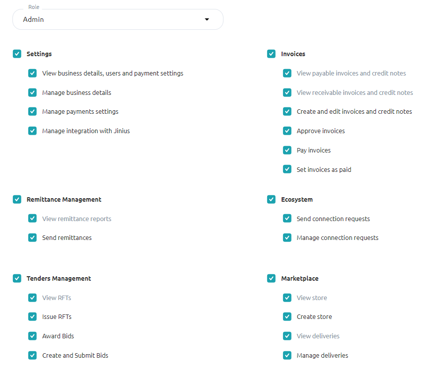 On the Configuration icon at the top right corner of your Jinius homepage, go to Settings > Business Profile > scroll to Users section